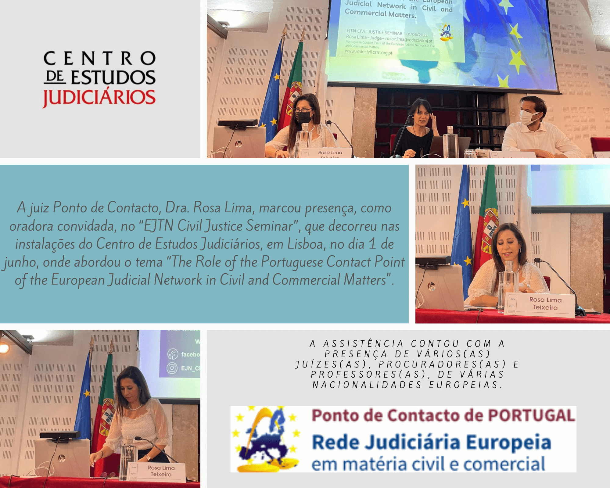 A juiz Ponto de Contacto, Dra. Rosa Lima, marcou presença, como oradora convidada, no “EJTN Civil Justice Seminar”, que decorreu nas instalações do Centro de Estudos Judiciários, em Lisboa, no dia 1 de junho, onde abordou o tema “The Role of the Portuguese Contact Point of the European Judicial Network in Civil and Commercial Matters“.